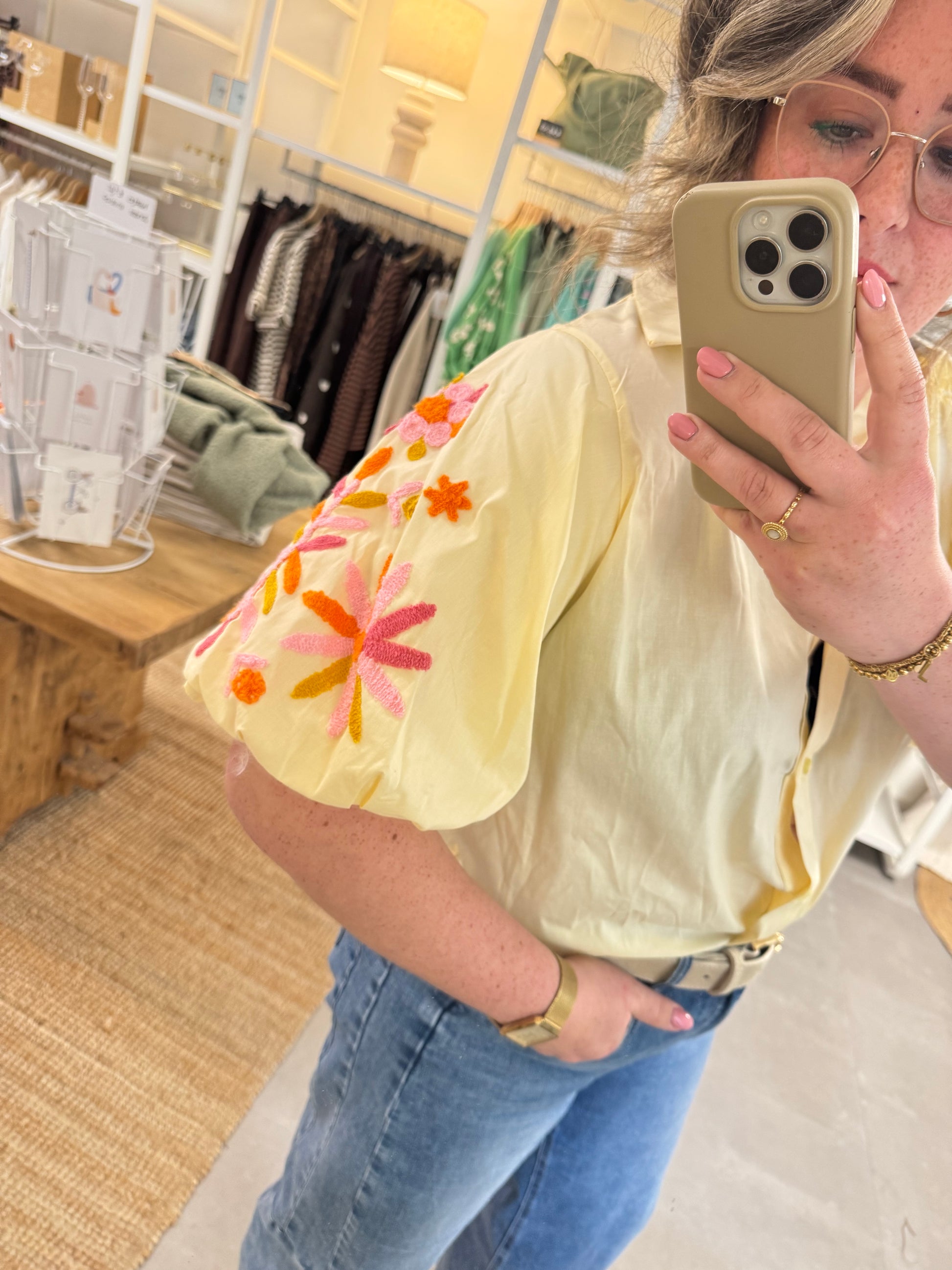 Oversized katoenen blouse met pofmouw, de mouw is mooi geborduurd met een leuke print.