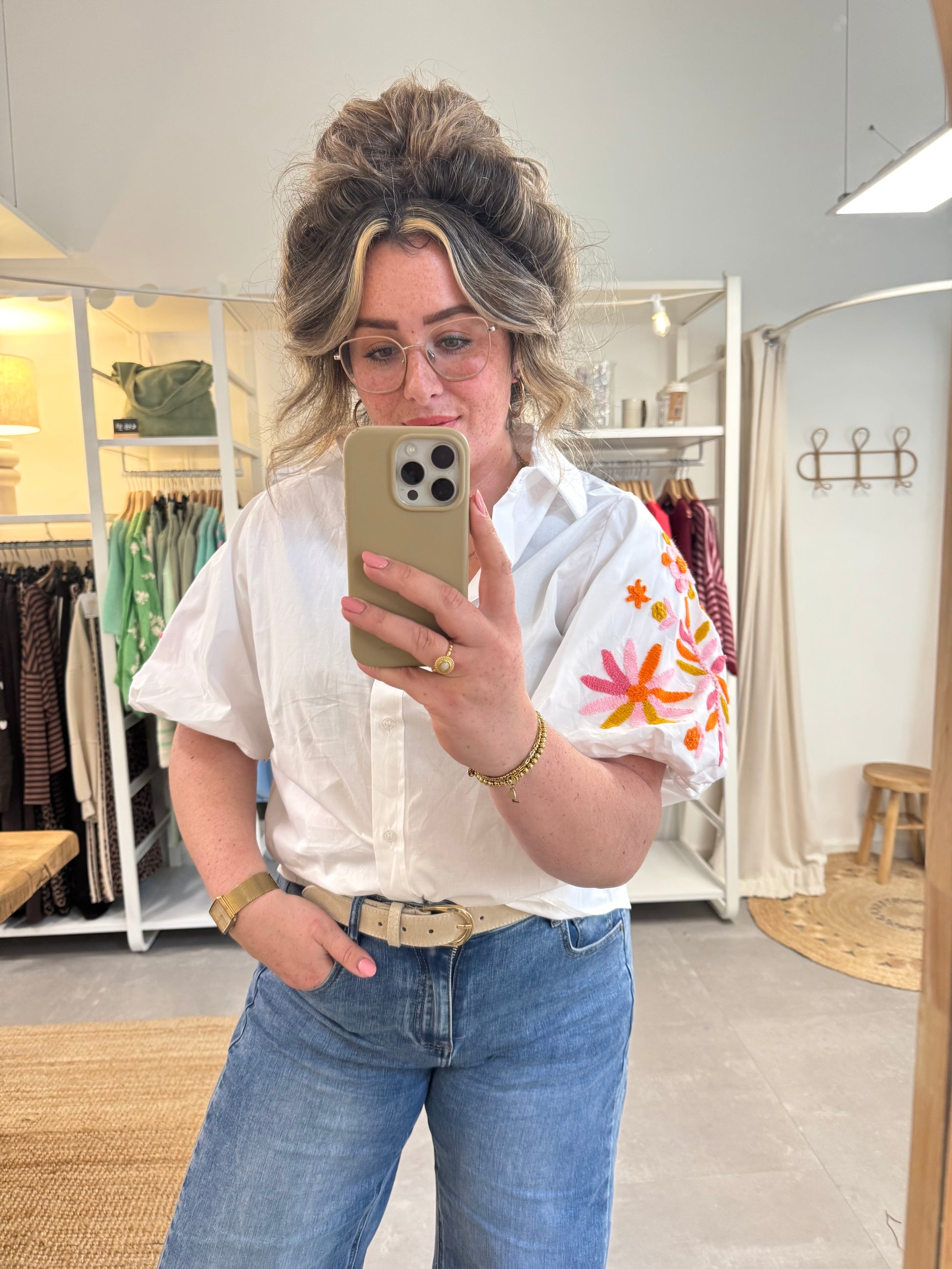 Oversized katoenen blouse met pofmouw, de mouw is mooi geborduurd met een leuke print.