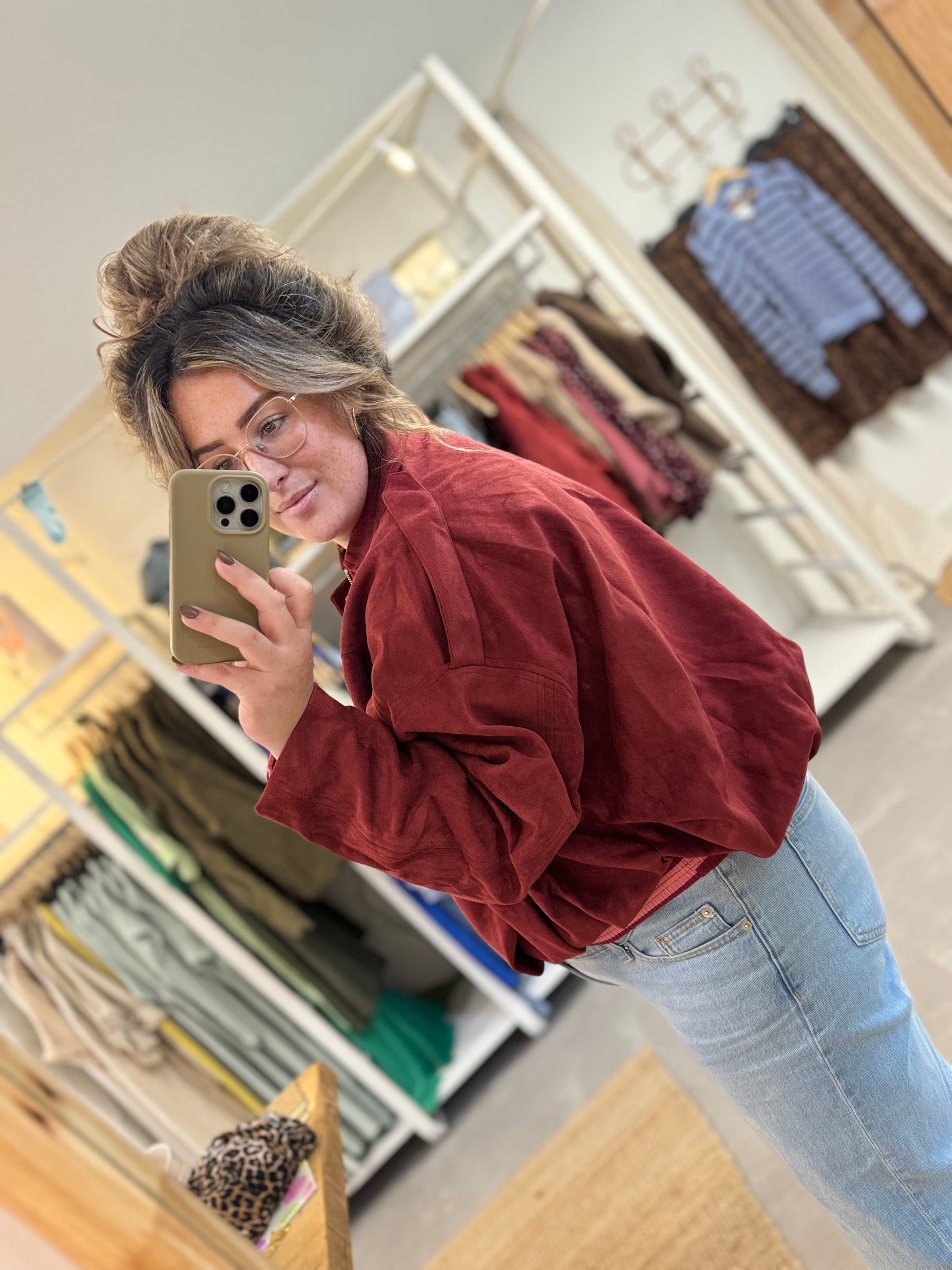 Het jasje is van een suedine stof gemaakt en is erg mooi van kwaliteit. Bij de schouders zit een detail, die vast zit met een drukknoopje. De onderkant van het jasje heeft een ballon effect door de plooien aan de onderkant. Het jasje is gevoerd en kan dicht worden gedragen met een rits.